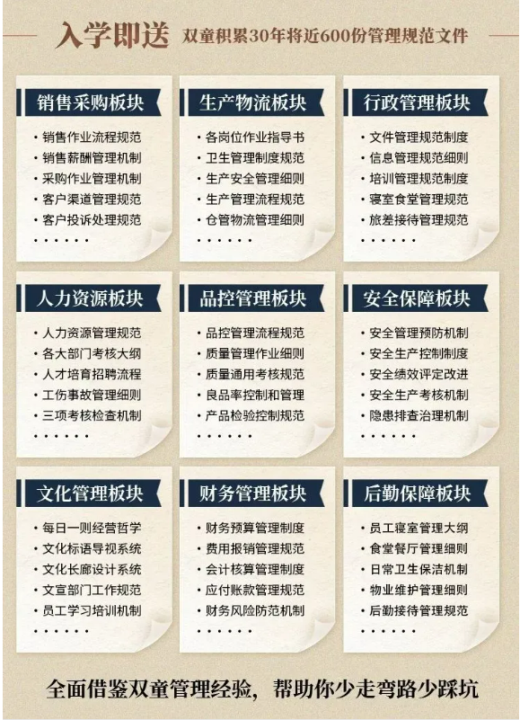 入學“隱形冠軍樓仲平思享薈”之后,你將獲得“雙童”積累了31年、包含了銷售、生產、行政、人力資源、品質、安全、文化管理、財務和后勤等9大板塊,近600份管理規范文件,可以幫助企業全面借鑒雙童管理經驗、少走彎路、少踩坑!