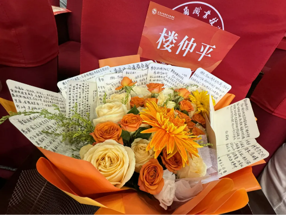 就在樓仲平老師飽含深情地發表寄語,還未走下講臺時,上演了一幕意外的溫馨畫面——學生代表手捧鮮花走上演講臺,將一束精心準備的花束送到了他手中。令人動容的是,花束中還夾雜著數百封來自學弟學妹們的感謝信,每一封信都寫滿了真摯的情感與感激之情。