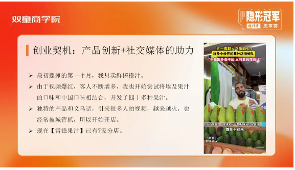 這些獨(dú)具特色的產(chǎn)品以及他使用義烏方言的交流方式,吸引了無(wú)數(shù)人前來拍攝視頻,使他的攤位愈發(fā)火爆。然而,這也帶來了城市管理的挑戰(zhàn)。好在義烏市有很好的創(chuàng)業(yè)環(huán)境,城管部門對(duì)其擺攤的行為雖然予以關(guān)注,但并沒有暴力驅(qū)逐,最終還幫助他辦理營(yíng)業(yè)執(zhí)照,開起了一家能夠正常運(yùn)轉(zhuǎn)的果汁店。