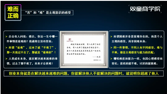 作為擁有47年創(chuàng)業(yè)史的創(chuàng)業(yè)老兵,樓仲平老師對于“苦難”始終有自己的觀點(diǎn):他認(rèn)為困難并非是客觀存在的,而是個(gè)人主觀的感受,而非困難本身。創(chuàng)業(yè)本身就是在解決越來越難的問題,你能解決他人不能解決的問題時(shí),就說明你超越了他人。