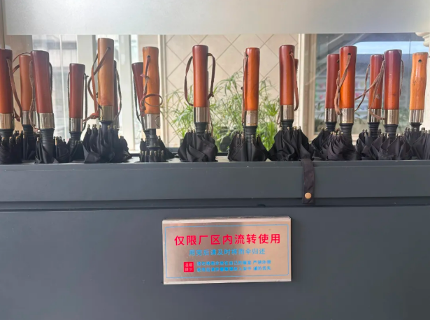 如今,"雙童"的流動傘設施已形成完善的服務體系。在行政樓、生產車間、餐廳、宿舍等6個人流量大的區域,300余把雨傘隨時待命,確保員工在廠區任何位置都能就近取用,真正實現了"雨天無憂",最大化地解決員工雨天出行難的窘境。